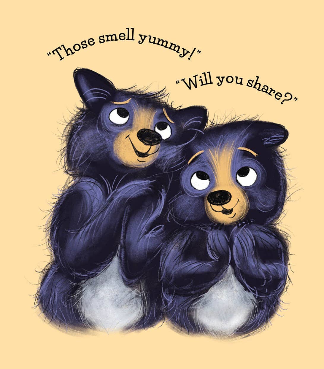 Roscoe has his campfire going and is toasting the most perfect marshmallow. He slides it onto a graham cracker, adds a chocolate square, and sandwiches it with another graham--the most perfect s'more--when Grizzly Bear shows up. Roscoe welcomes Grizzly--and bear after bear!--to his gooey forest feast keeping hungry (and grumbly) guests content by sharing s'more after s'more. What to do but make s'more?!